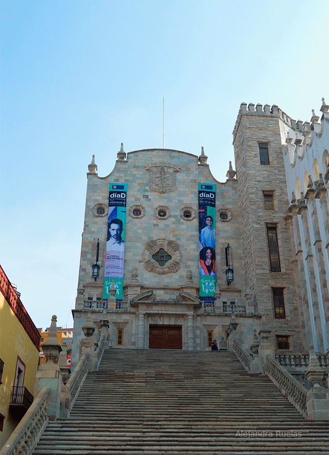 Al salir de este edificio, seguiremos visitando la Universidad y entraremos al edificio contiguo que tiene una de las tomas fotográficas obligadas de Guanajuato...