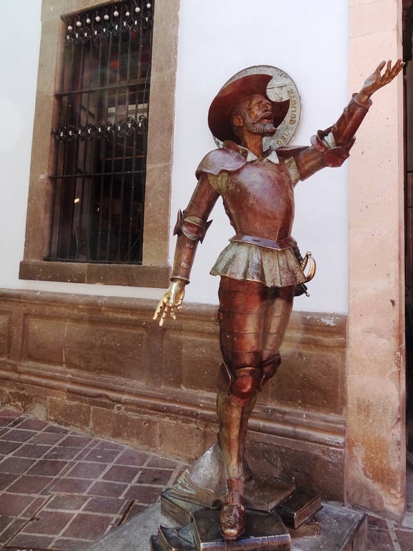 Del jardín, tomaremos el pequeño camino al lado derecho de la salida de la calle subterránea que habíamos visto, justo en la fachada del Hotel San Diego. Encontraremos la placa que nos recuerda estar en la Capital Cervantina de América, y una escultura del Quijote. Arriba, el Pípila. Símbolo de la ciudad.Al fondo se encuentra el callejón de la Constancia, por donde circulan las estudiantinas - tunas - que "callejoneando" van al callejón del beso.