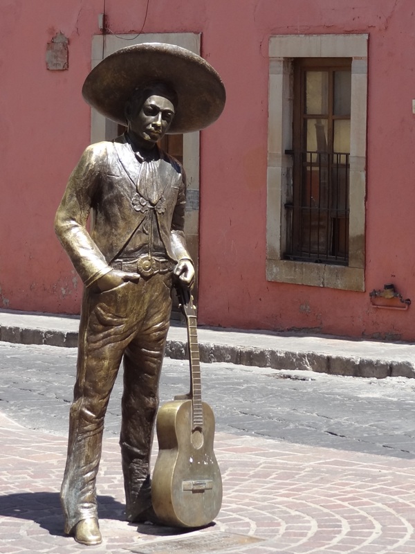 Continuando por la calle del nivel superior, pasamos un pequeño jardín urbano - la plaza Elisa López López, una gran maestra que estuvo al frente de la Escuela Normal de Guanajuato - un negocio de renta de bicicletas para los más atléticos (473) 114 20 31, y llegamos a un ensanchamiento, donde a la izquierda vemos una pequeña plaza con una estatua del artista Raúl Jaramillo dedicada al personaje más popular nacido en esta ciudad...