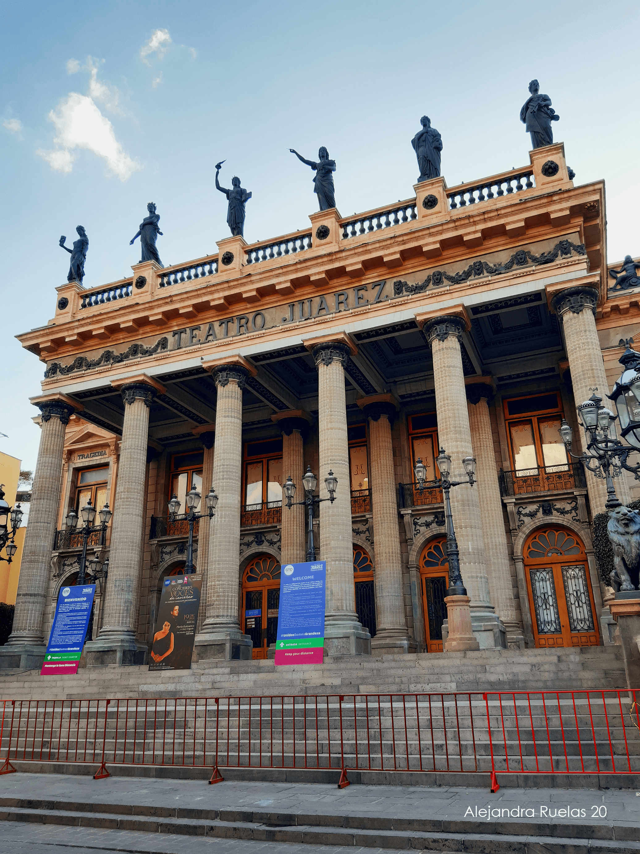 es una muestra de la grandeza arquitectónica de la ciudad de Guanajuato, tiene un peristilo dórico con capiteles de bronce y estatuas que representan a 8 de las musas (Melpómene, Talía, Polimnia, Terpsícore, Euterpe, Clío, Calíope y Urania), faltando Erato, la de la poesía. El pórtico está custodiado por dos monumentales esculturas de leones de bronce.
